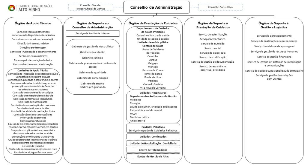 São Órgãos de Gestão e Logística: serviço de aprovisionamento; serviço de instalações e equipamentos; serviço hoteleiro e de apoio geral; serviço de gestão de recursos humanos; serviço de gestão financeira; serviço de gestão de sistemas de informação e comunicações; serviço de saúde ocupacional/saúde do trabalho; serviço de gestão das relações com utentes.